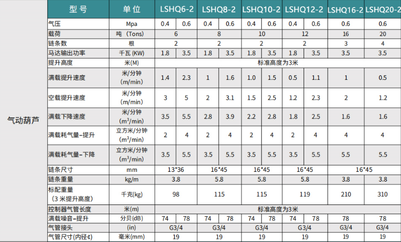 LSHQ型環(huán)鏈氣動葫蘆中規(guī)格參數(shù):